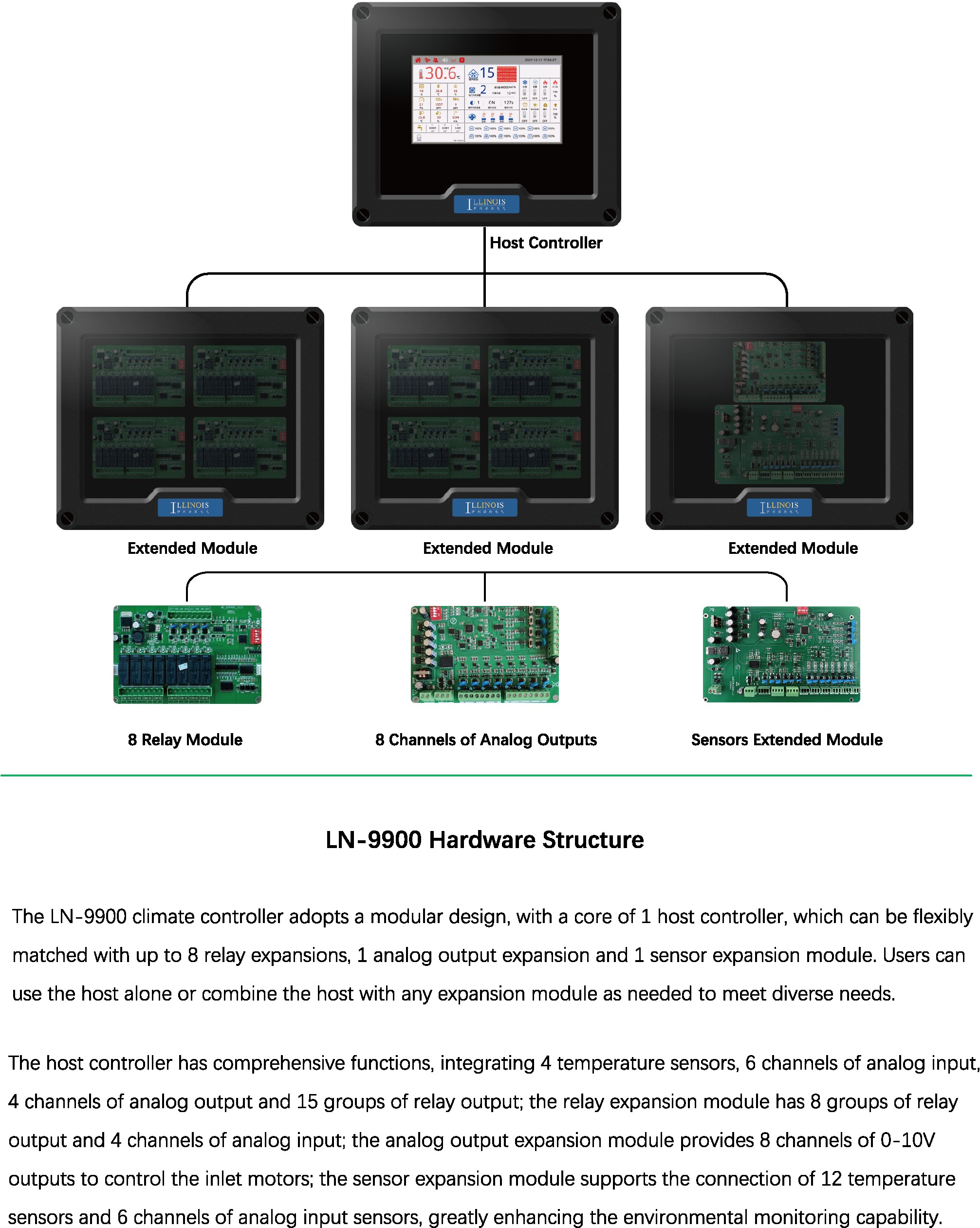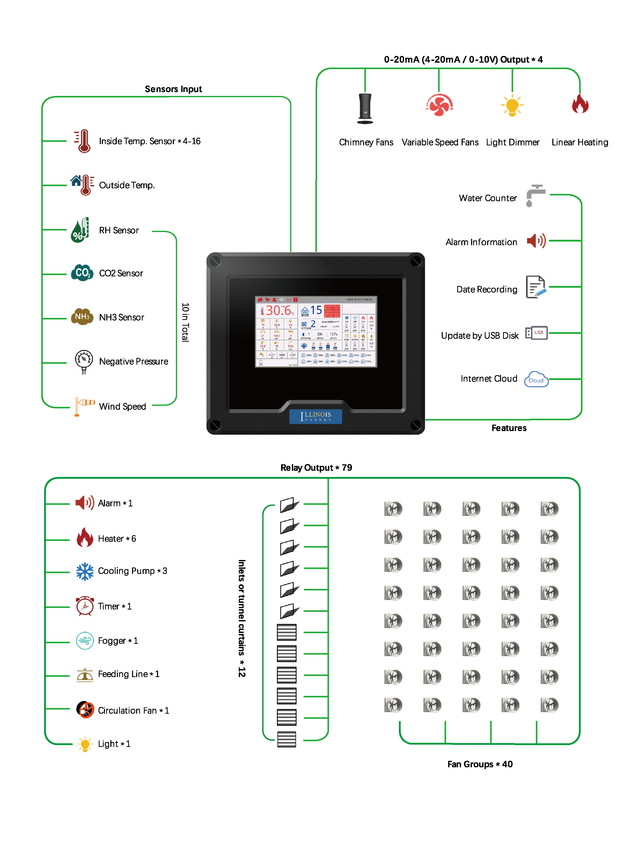 LN-9900 is an intelligent environment controller designed for large-scale modern poultry farming. It is equipped with a 10-inch touch screen and powerful functions. It can achieve precise control of 4 sets of variable frequency fans (supporting 0-100% stepless speed regulation), manage 40 sets of fixed speed fan units at the same time, provide 40 levels of intelligent ventilation gear selection, and an intelligent system linked with 12 sets of air inlets or curtains.