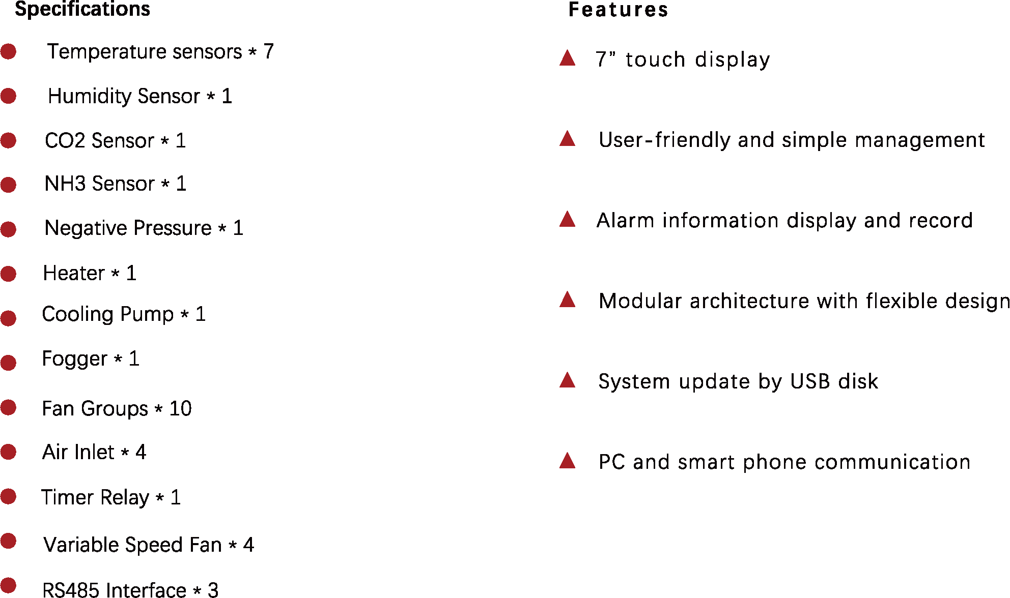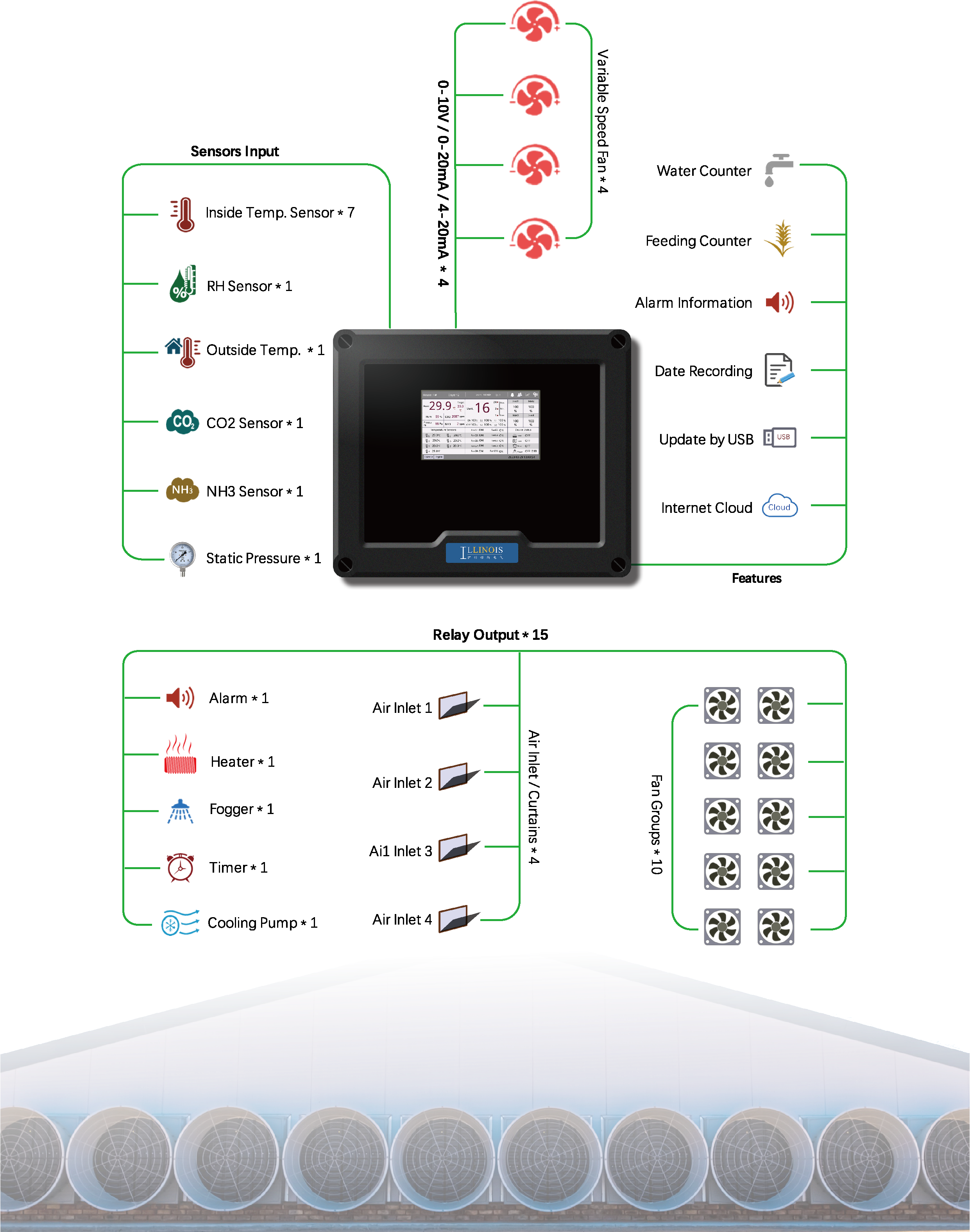 The LINO Touch SE+ Controllers, an upgrade model of SE controller, designed with 7 inch touch screen and 15 relay outputs, include up to 10 relays for fan groups with 24 ventilation grades, up to 7 temperature sensors, 1 humidity sensor, 1 CO2 sensor, 1 NH3 sensor, 1 negative pressure sensor, 4 air inlets or curtainers, 1 cooling pump, 1 set of spray equipment, 4 sets of air inlets or curtaibs, 1 set of timer, and can also control 4 sets of variable speed fan units.